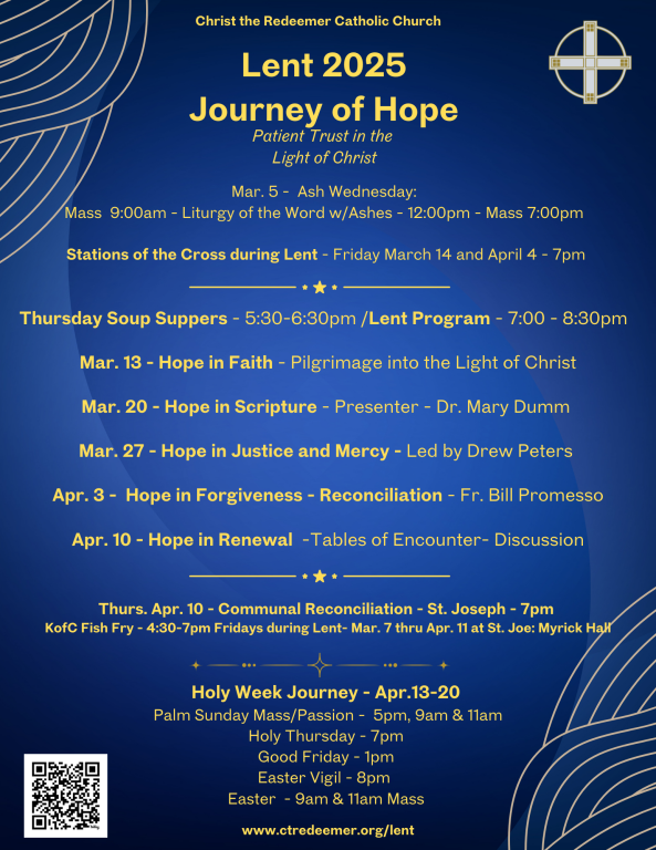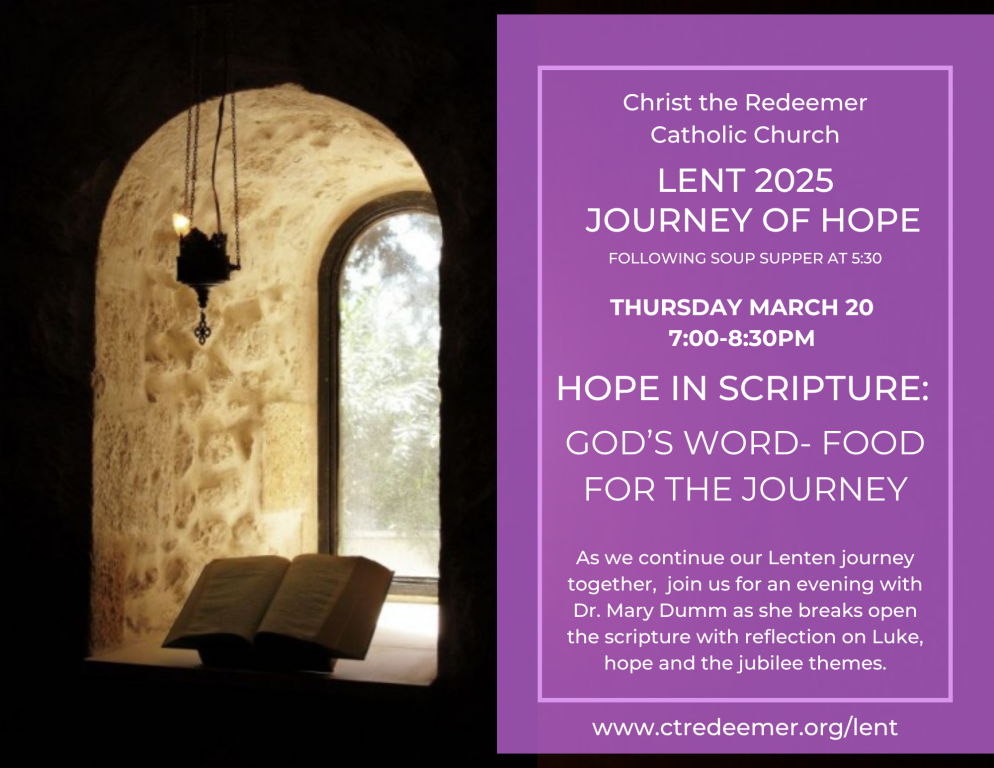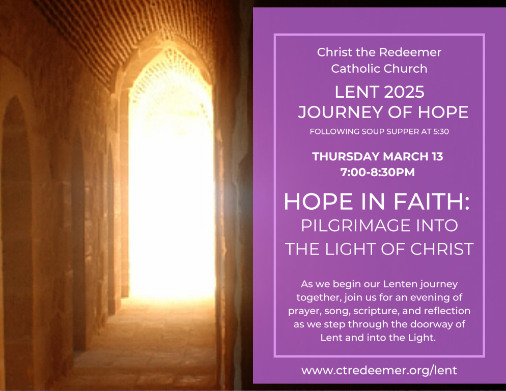 Our Lent 2025 theme is Journey of Hope: Patient Trust in the Light of Christ. It draws inspiration from this year’s Jubilee theme Pilgrimage of Hope. A pilgrimage is a journey to a sacred and holy place. Our journey of faith and our Lenten journey can be looked at as a pilgrimage.